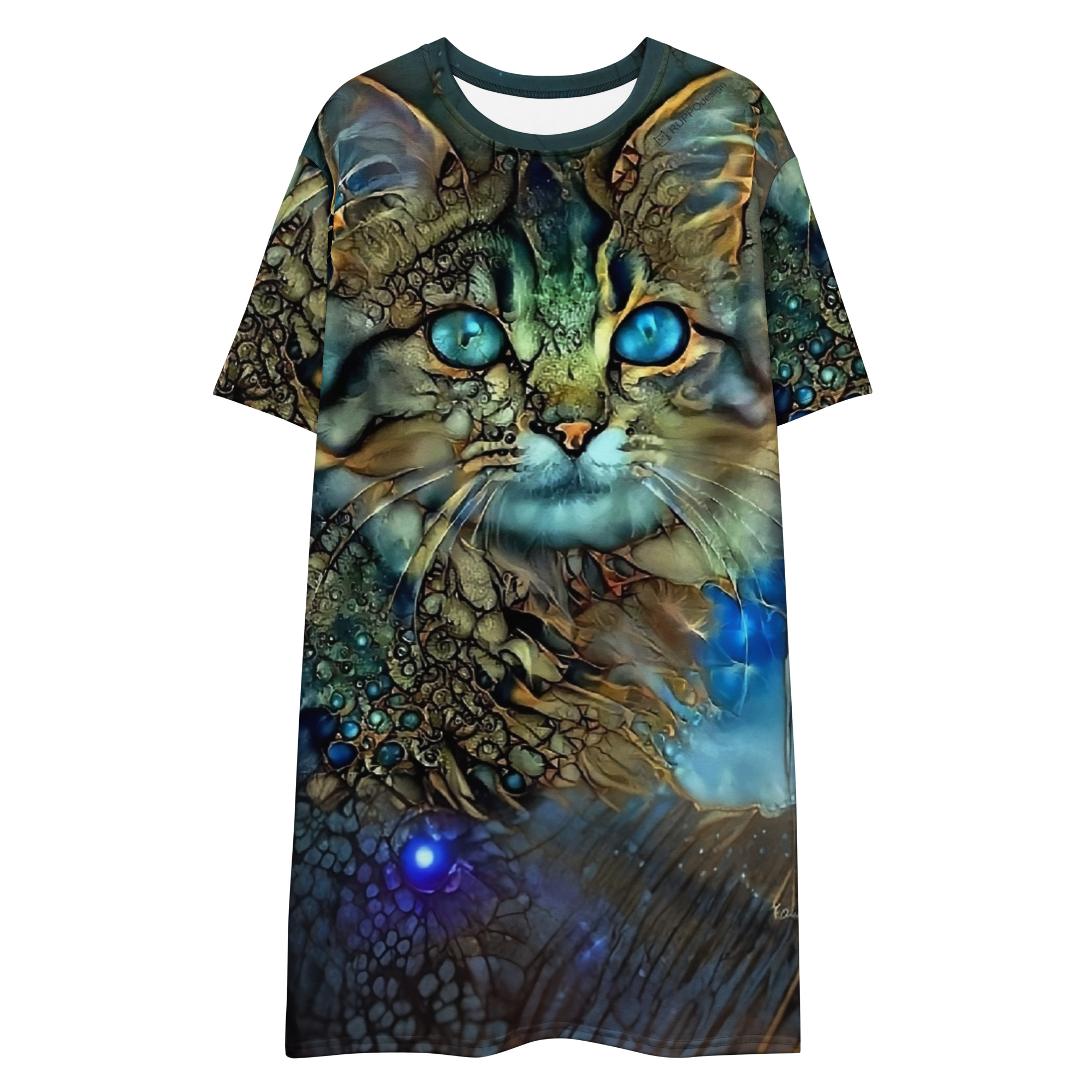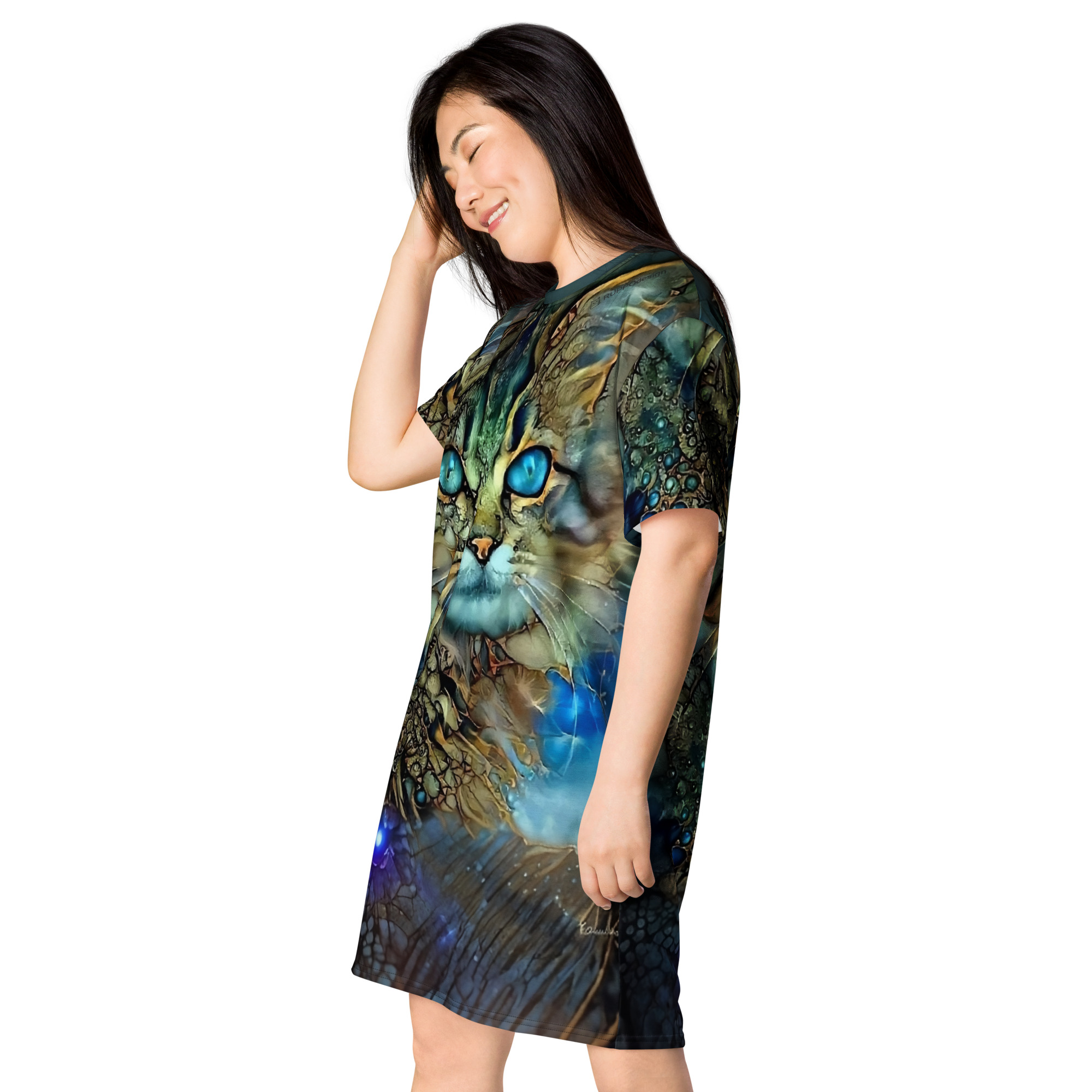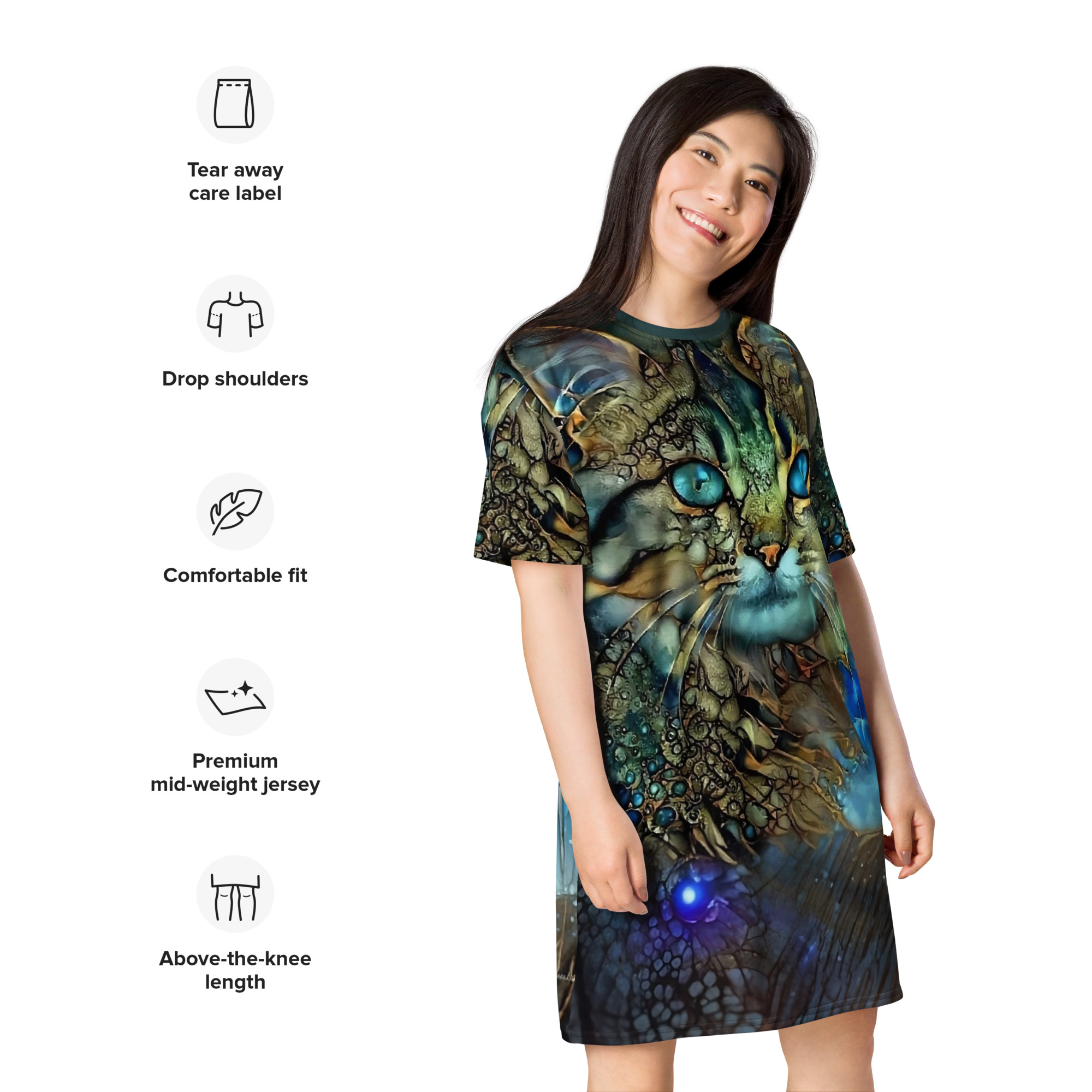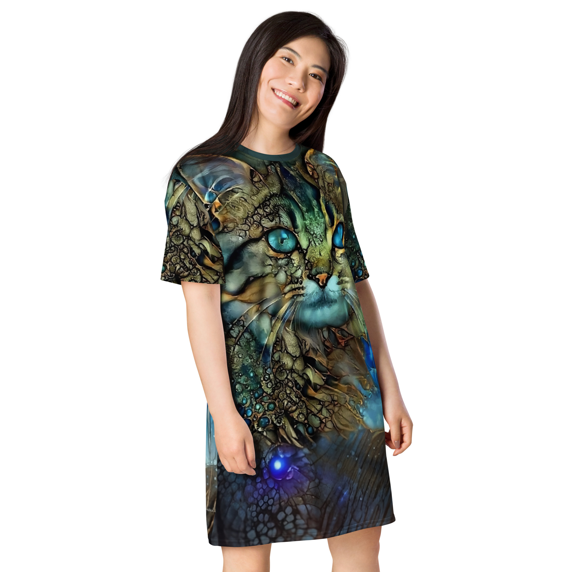 Das Dreamcat T-Shirt-Kleid ist dein Kleid für Tage, an denen du einfach du sein willst – frei, bequem und ein bisschen magisch. Die leuchtend blauen Augen der Dreamcat, kombiniert mit Gold- und Türkistönen, wirken wie ein nächtlicher Sternenhimmel zum Anziehen: Träume groß und wandle im Sternenlicht.
