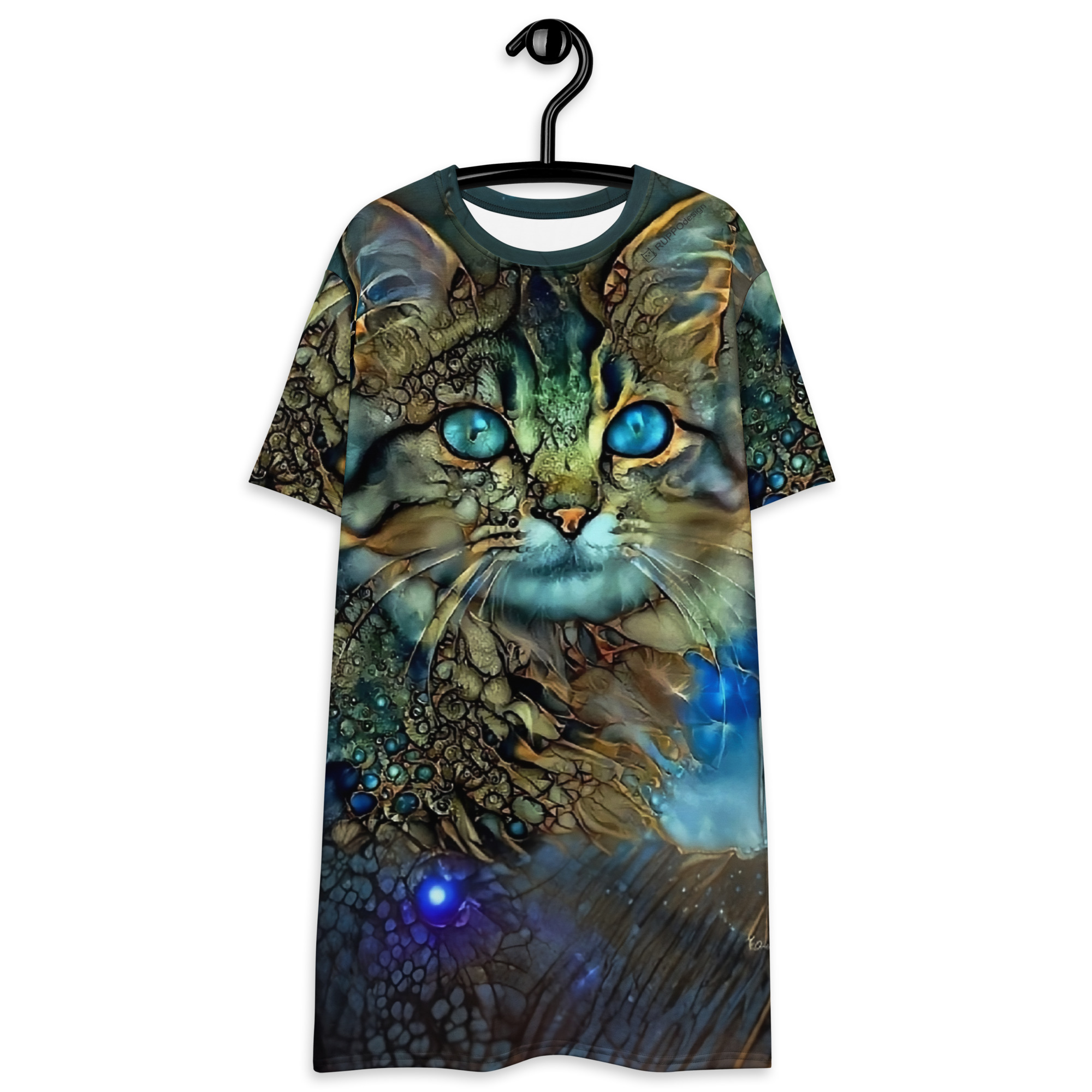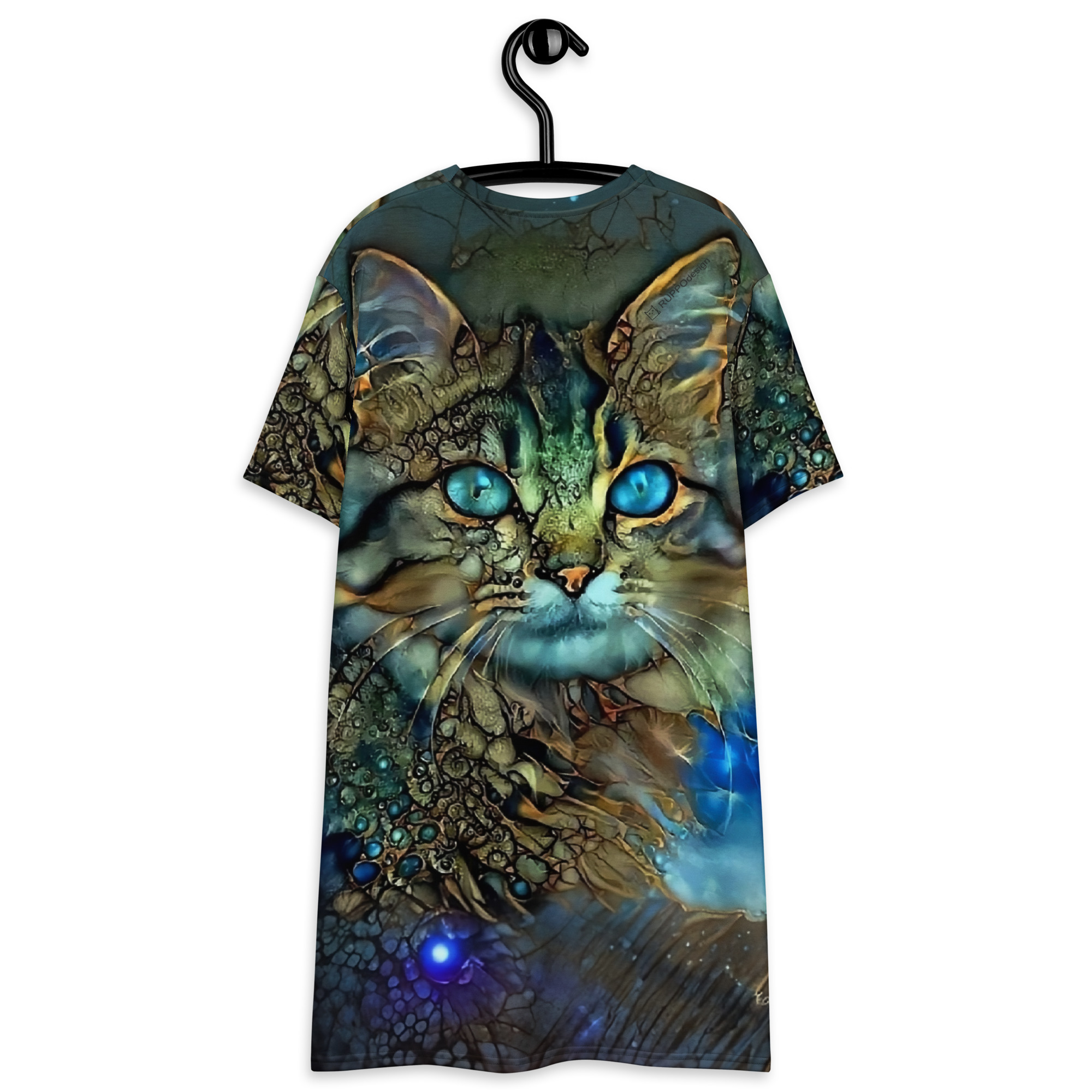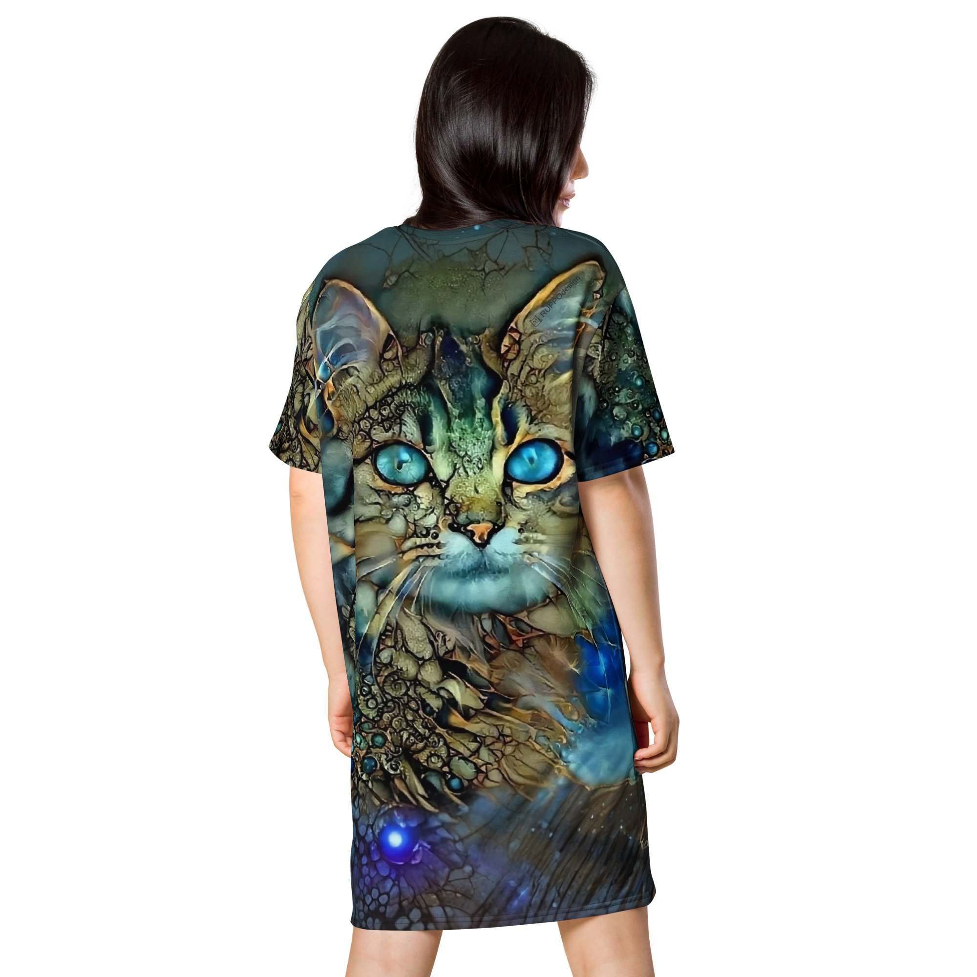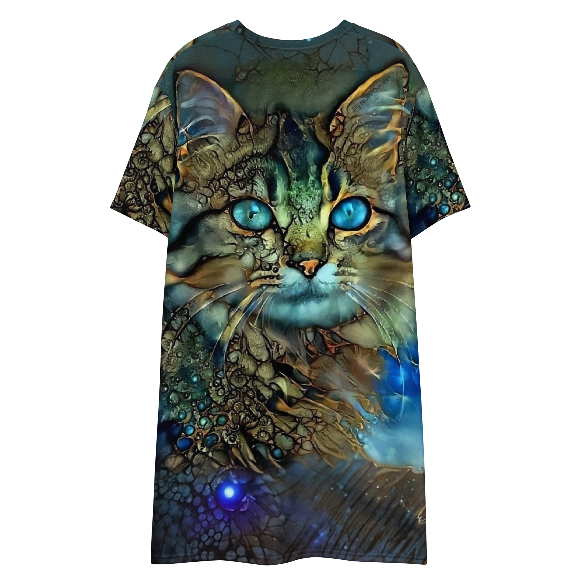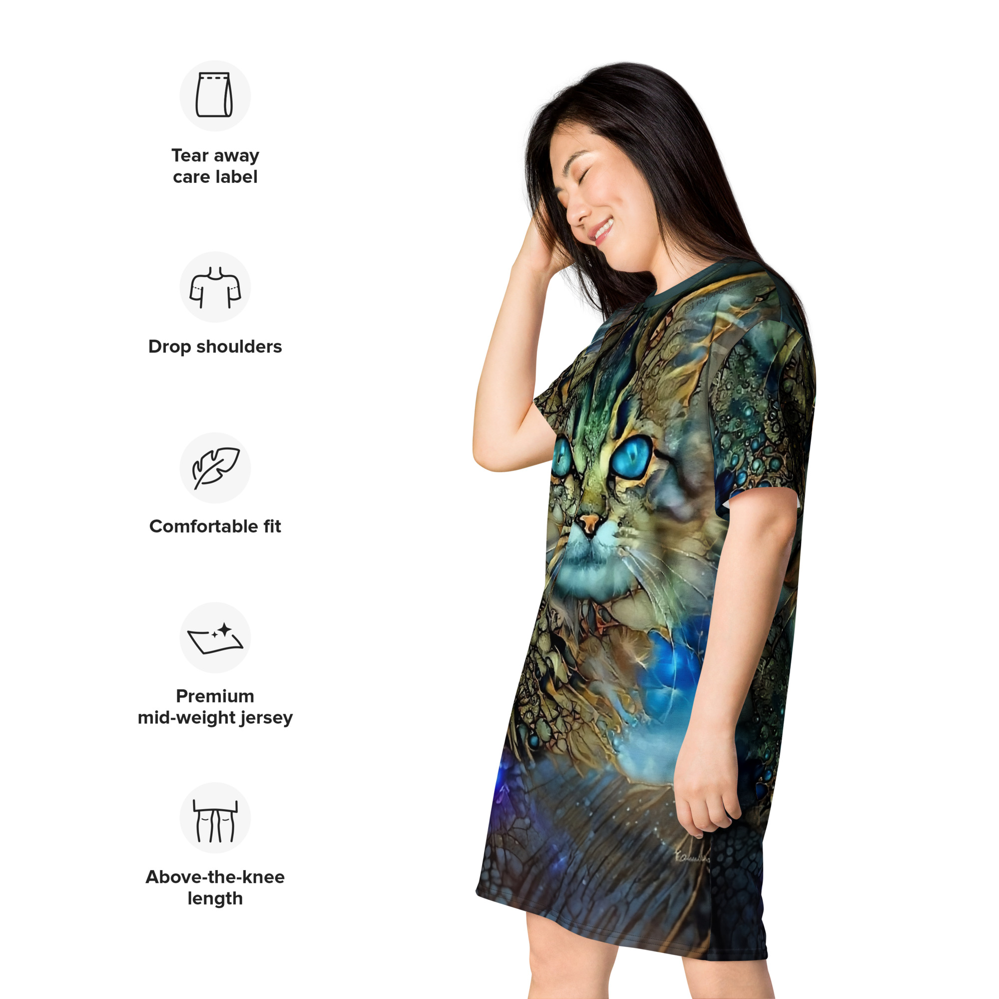 Das Dreamcat T-Shirt-Kleid ist dein Kleid für Tage, an denen du einfach du sein willst – frei, bequem und ein bisschen magisch. Die leuchtend blauen Augen der Dreamcat, kombiniert mit Gold- und Türkistönen, wirken wie ein nächtlicher Sternenhimmel zum Anziehen: Träume groß und wandle im Sternenlicht.