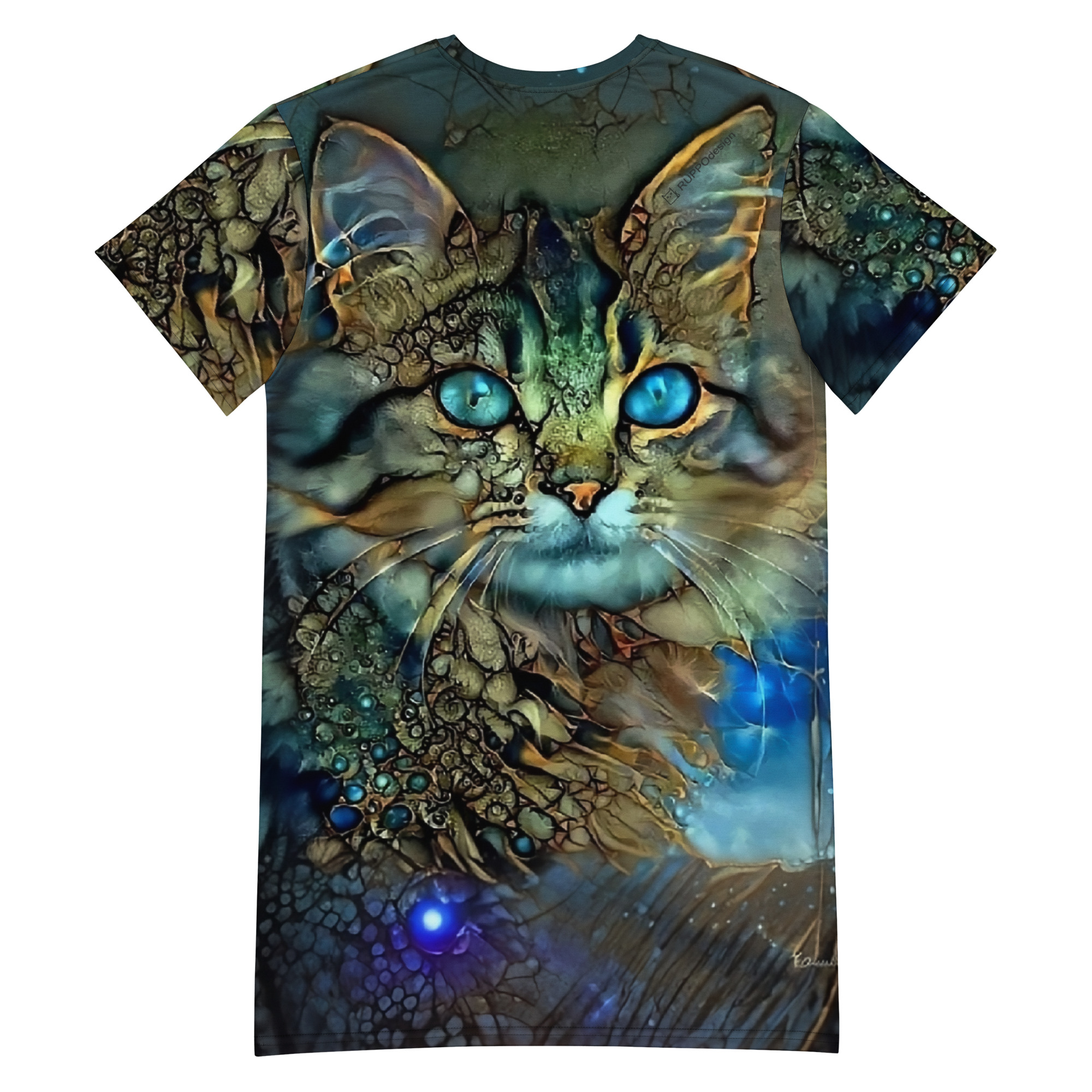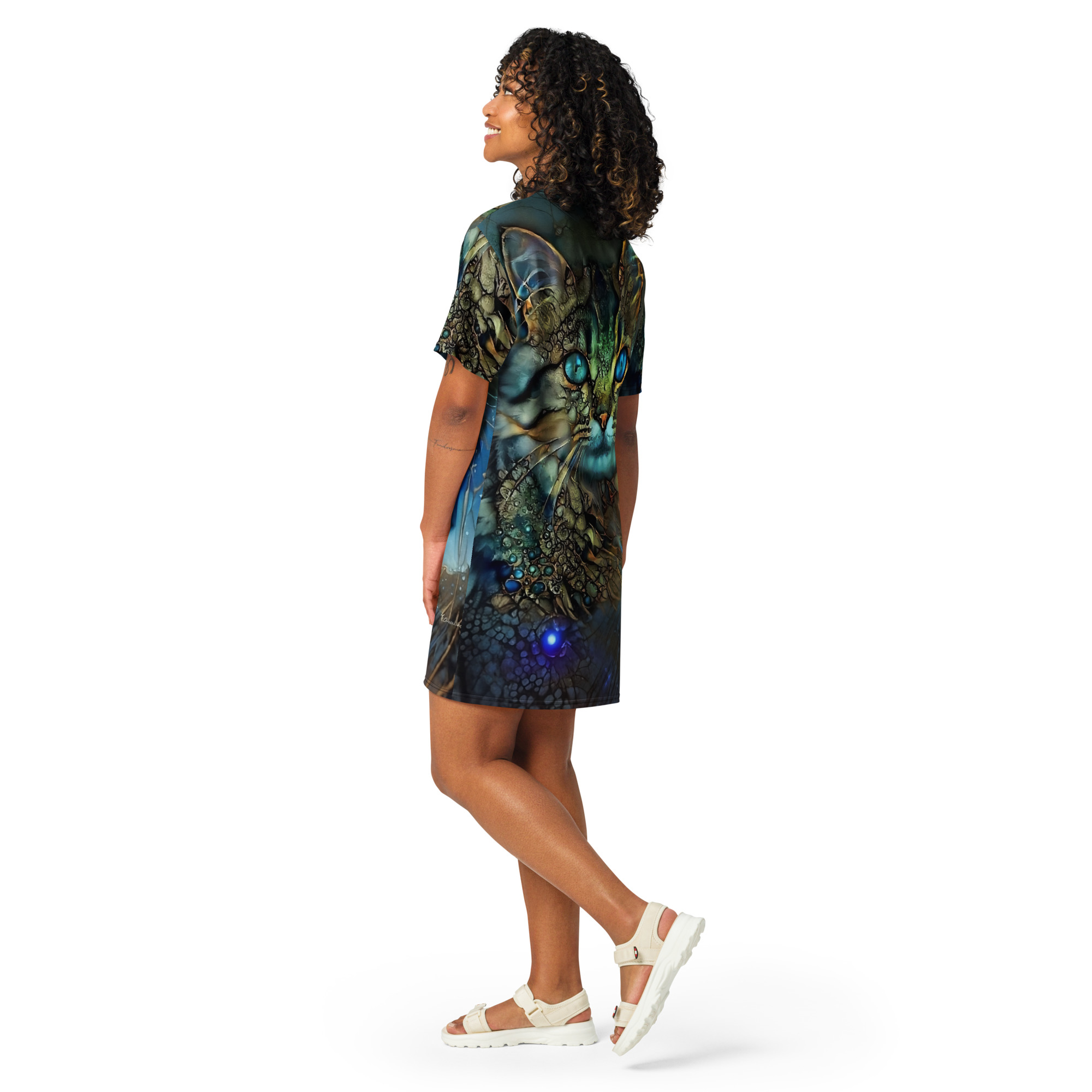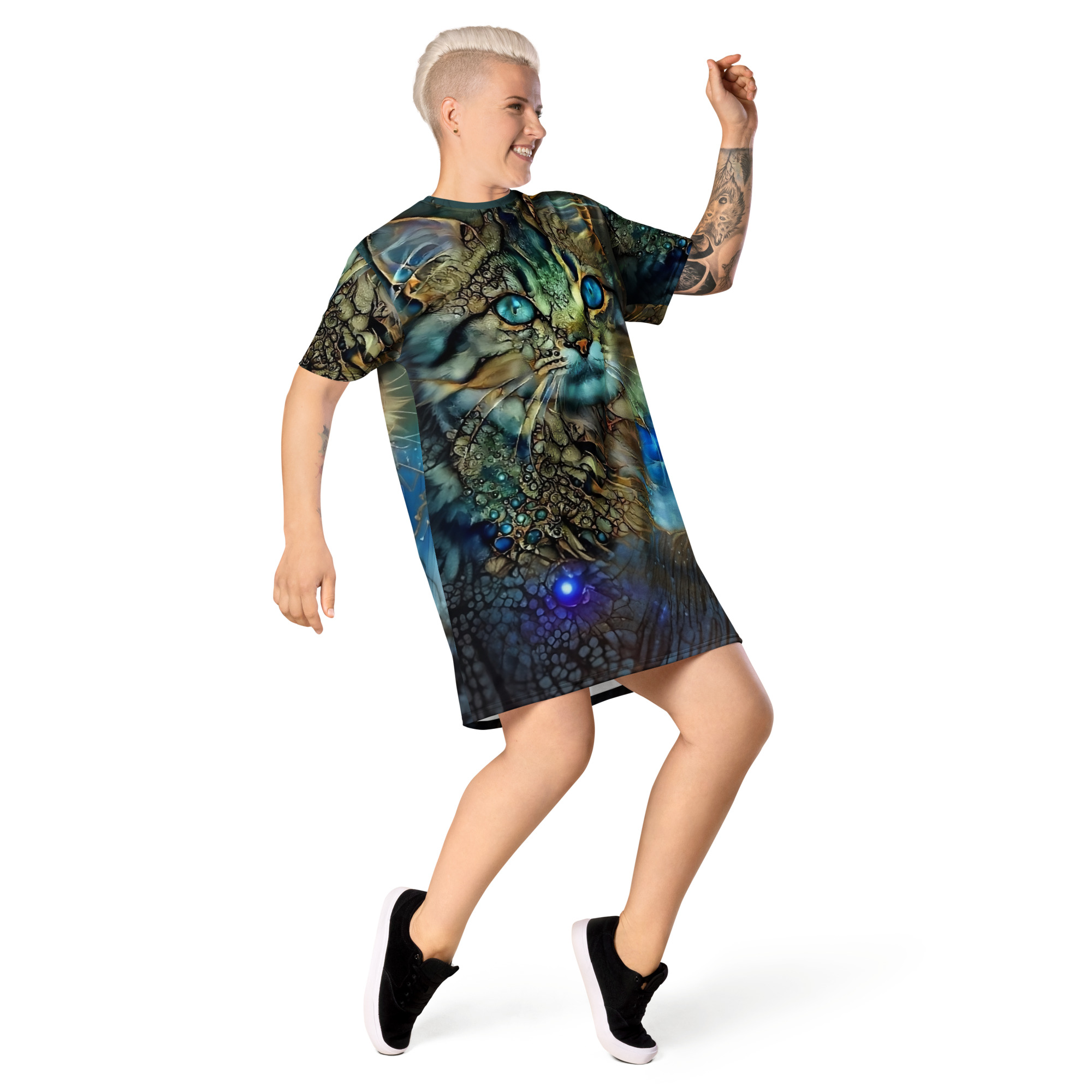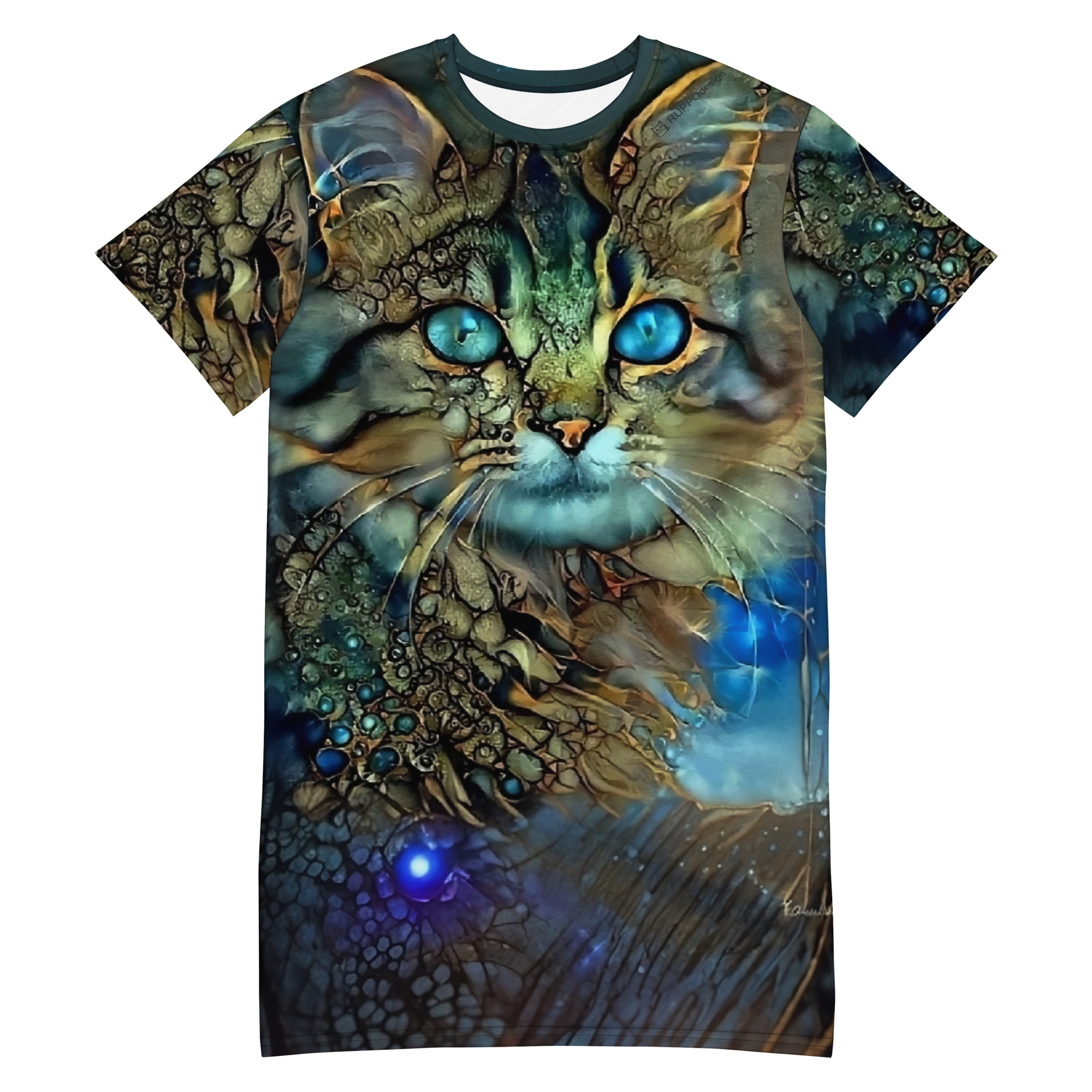 Das Dreamcat T-Shirt-Kleid ist dein Kleid für Tage, an denen du einfach du sein willst – frei, bequem und ein bisschen magisch. Die leuchtend blauen Augen der Dreamcat, kombiniert mit Gold- und Türkistönen, wirken wie ein nächtlicher Sternenhimmel zum Anziehen: Träume groß und wandle im Sternenlicht.