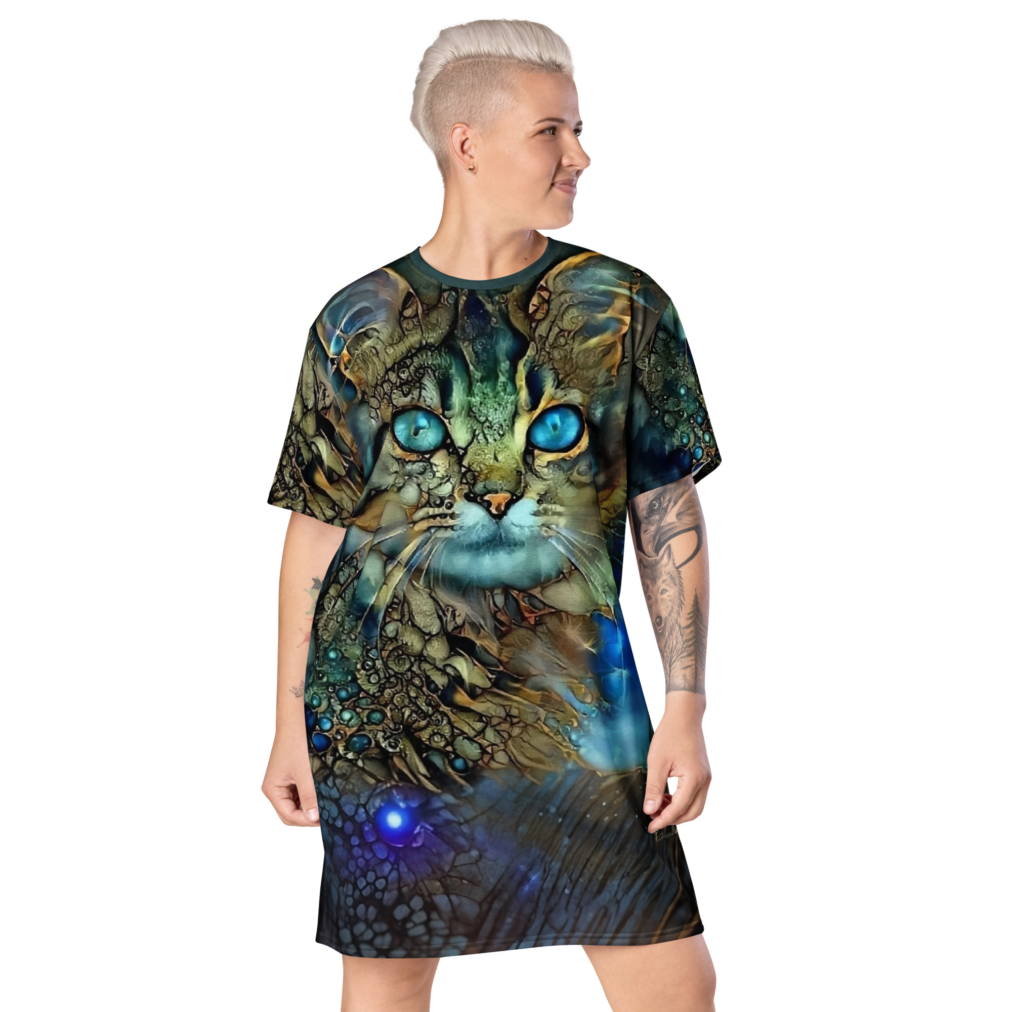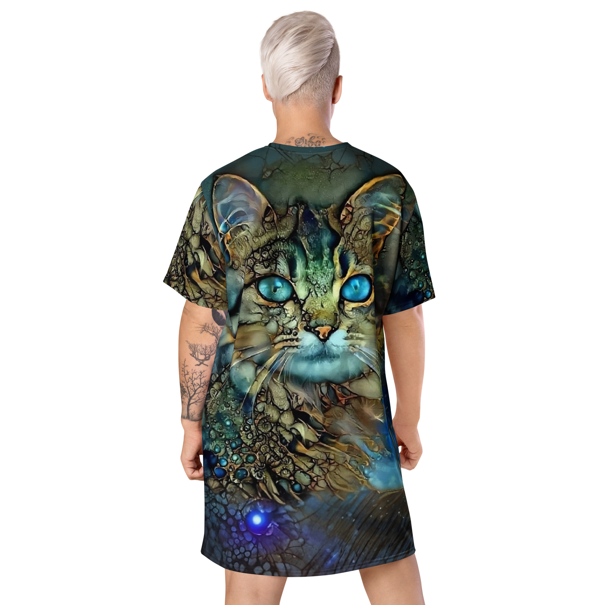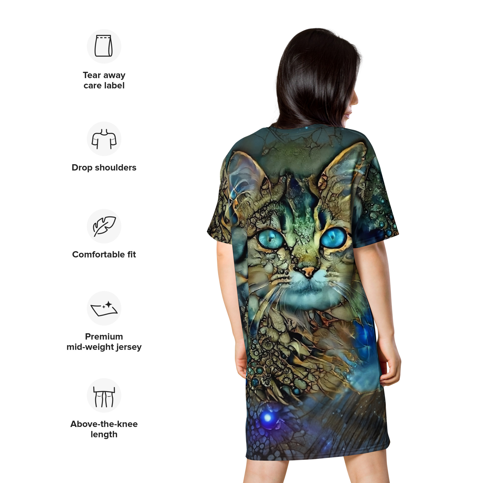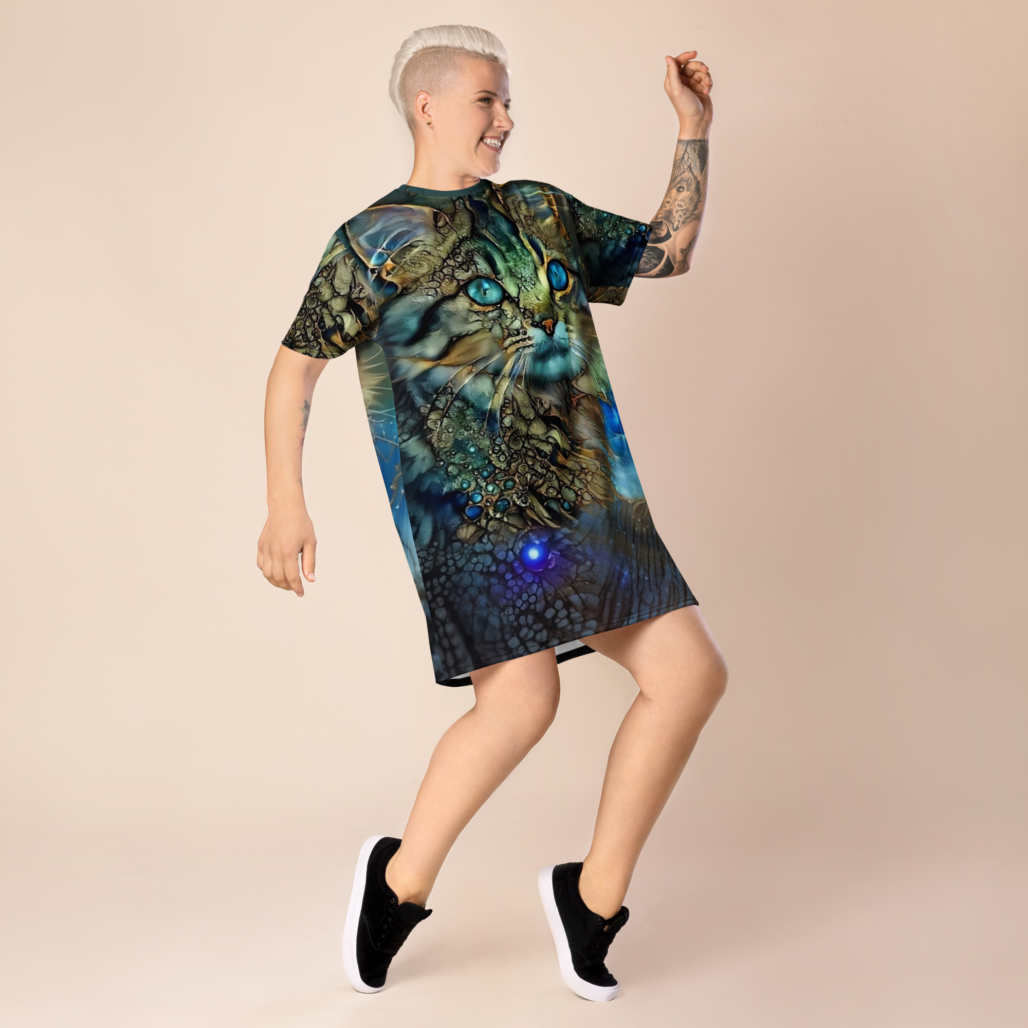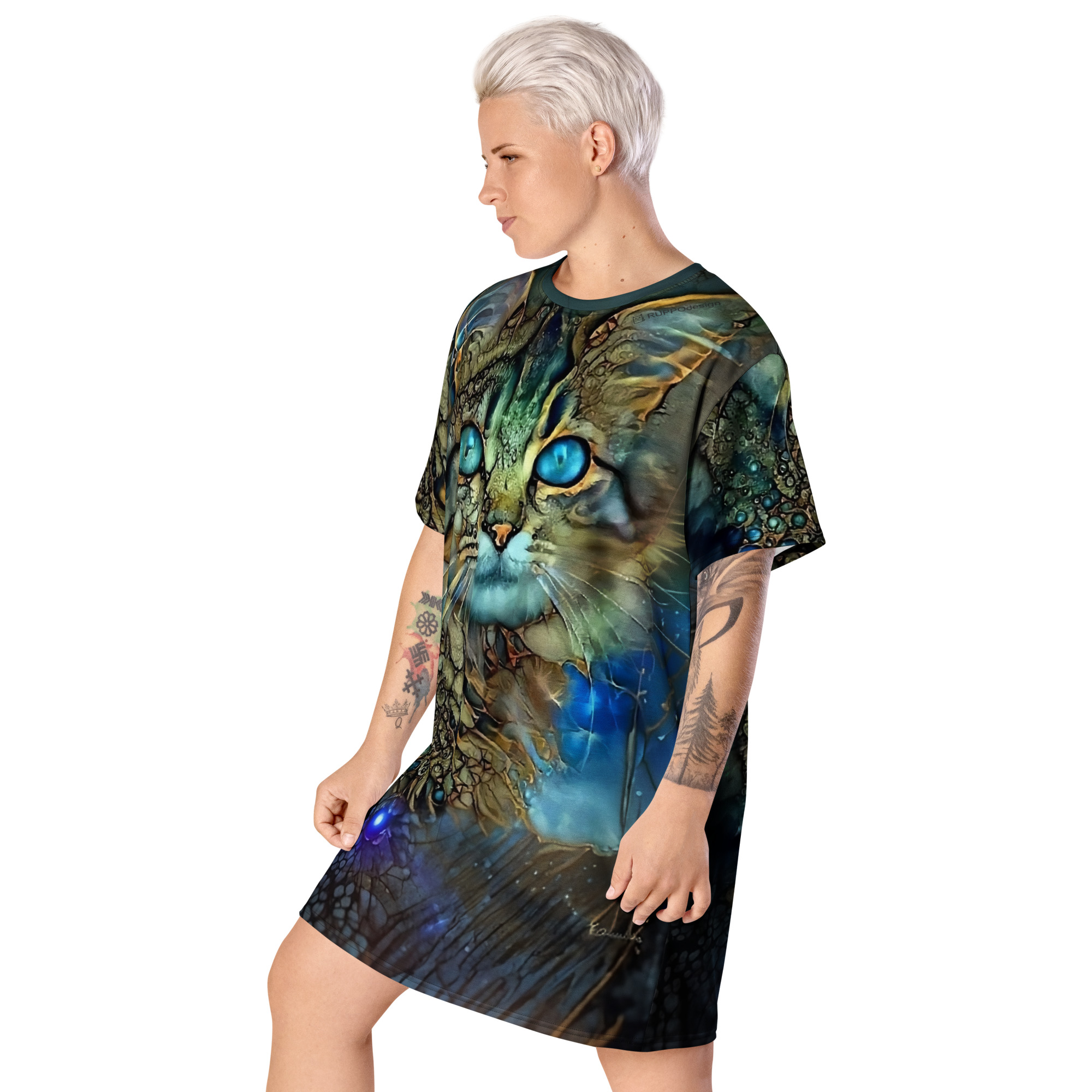Das Dreamcat T-Shirt-Kleid ist dein Kleid für Tage, an denen du einfach du sein willst – frei, bequem und ein bisschen magisch. Die leuchtend blauen Augen der Dreamcat, kombiniert mit Gold- und Türkistönen, wirken wie ein nächtlicher Sternenhimmel zum Anziehen: Träume groß und wandle im Sternenlicht.