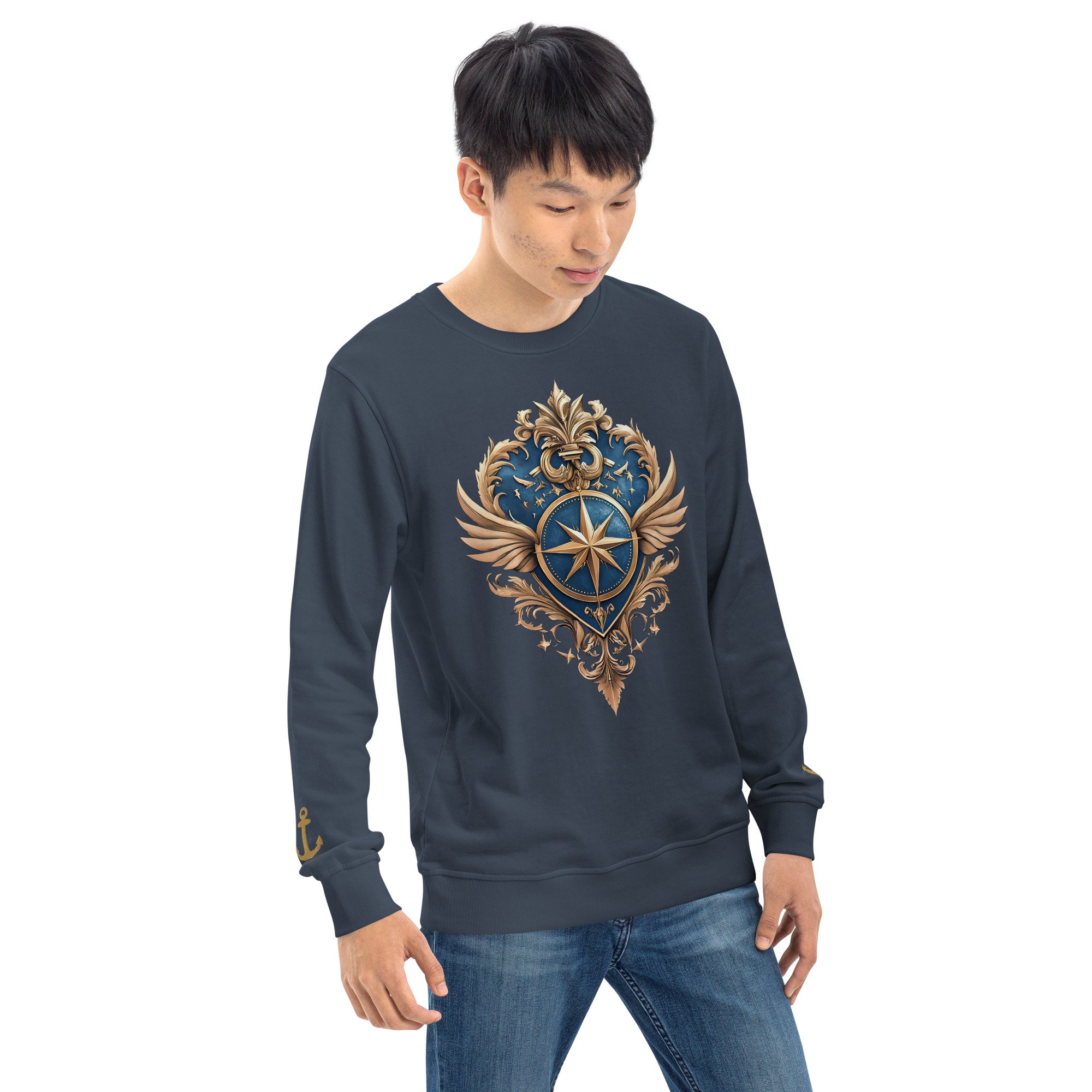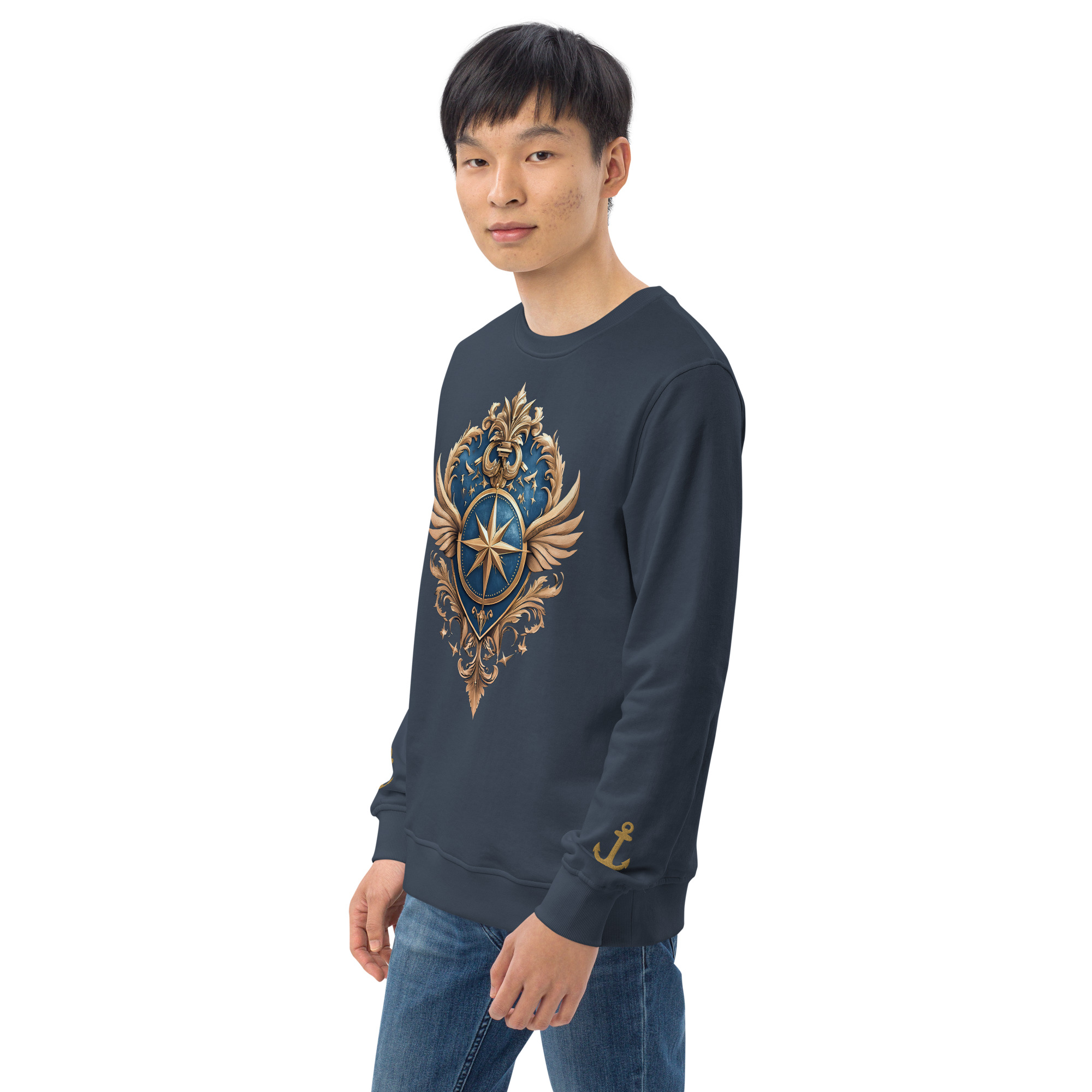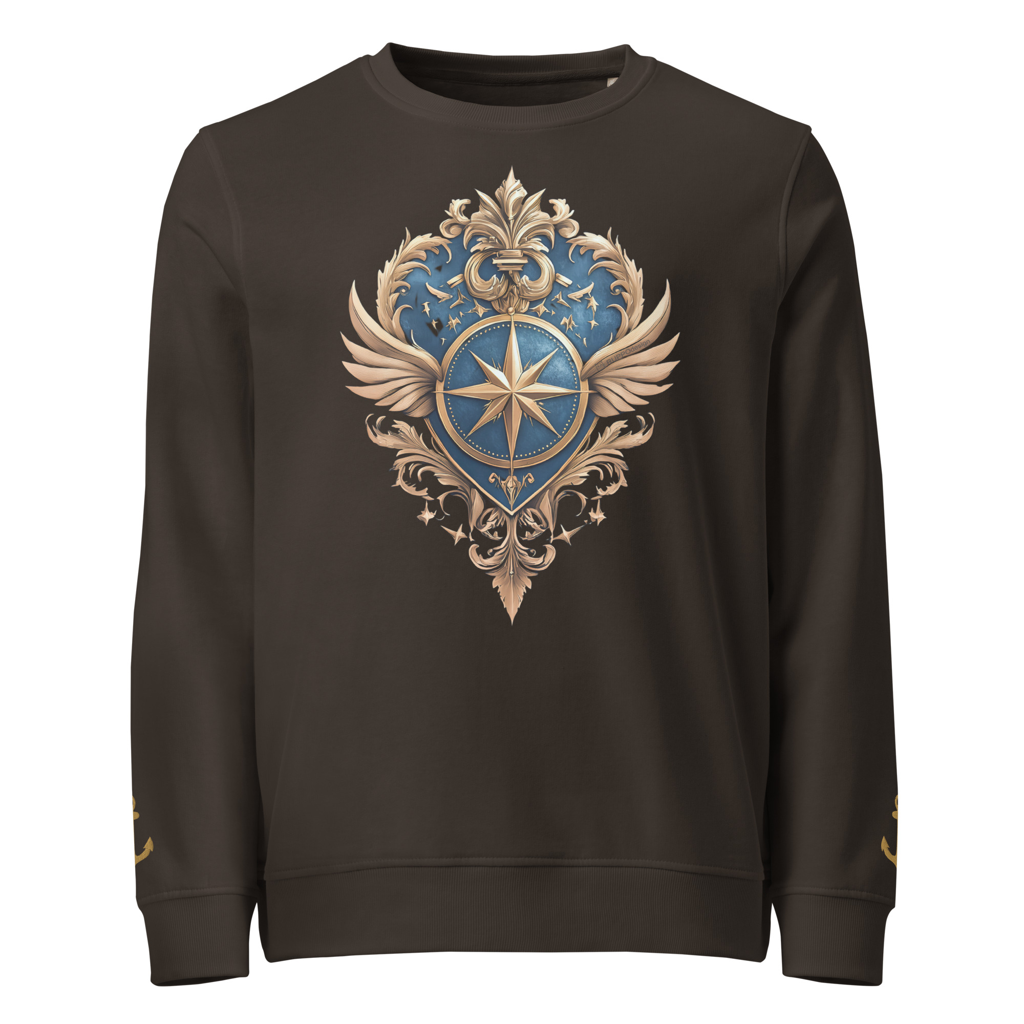 Ein warmer, weicher Unisex Bio-Pullover mit dem Kurszeichen-Kompass auf der Brust und zwei eingestickten Ankern an den Ärmeln. Maritime Symbolik, klarer Style – aus der Trophy-Style-Kategorie im RUPPOshop. Logo RUPPOdesign am Außen-Etikett hinten.