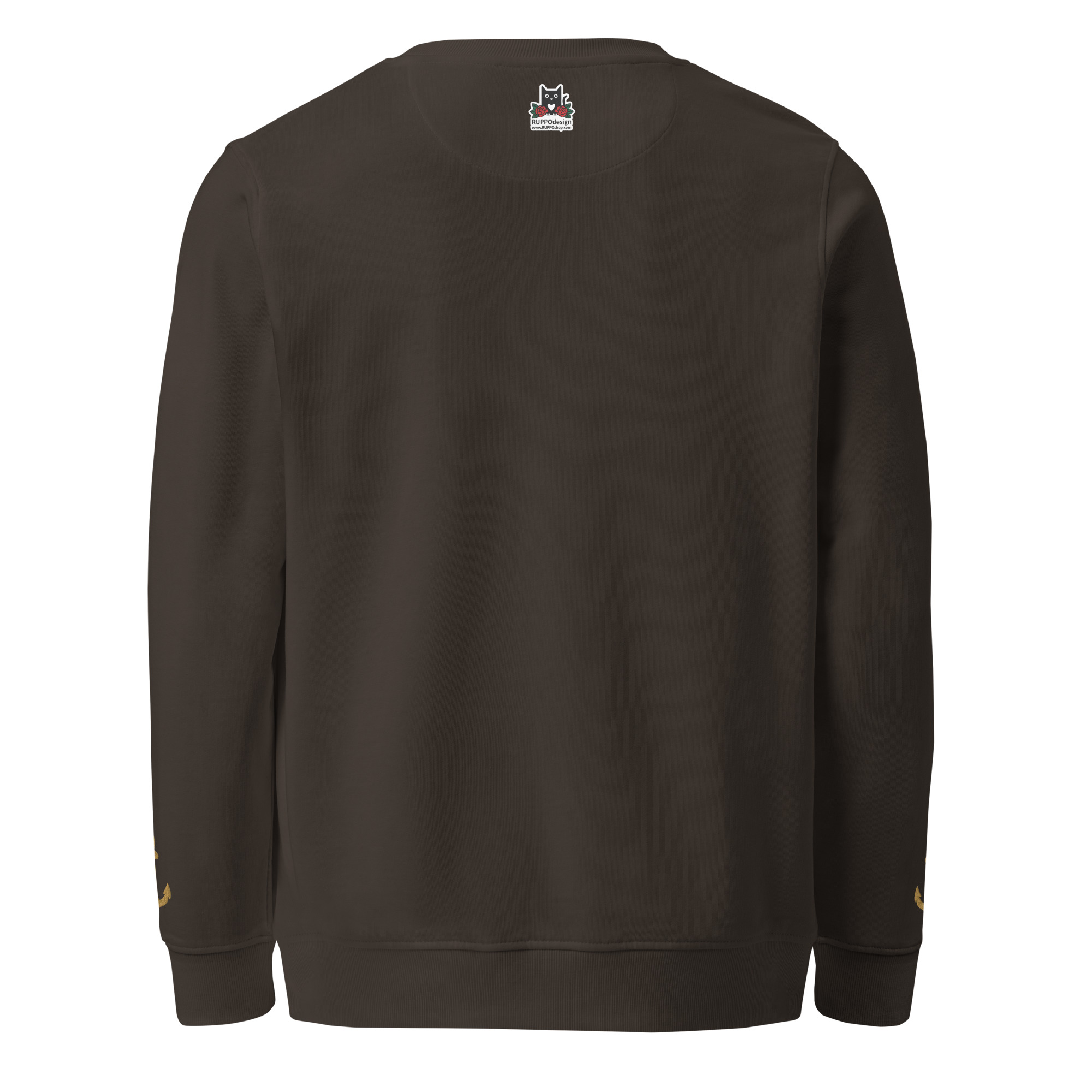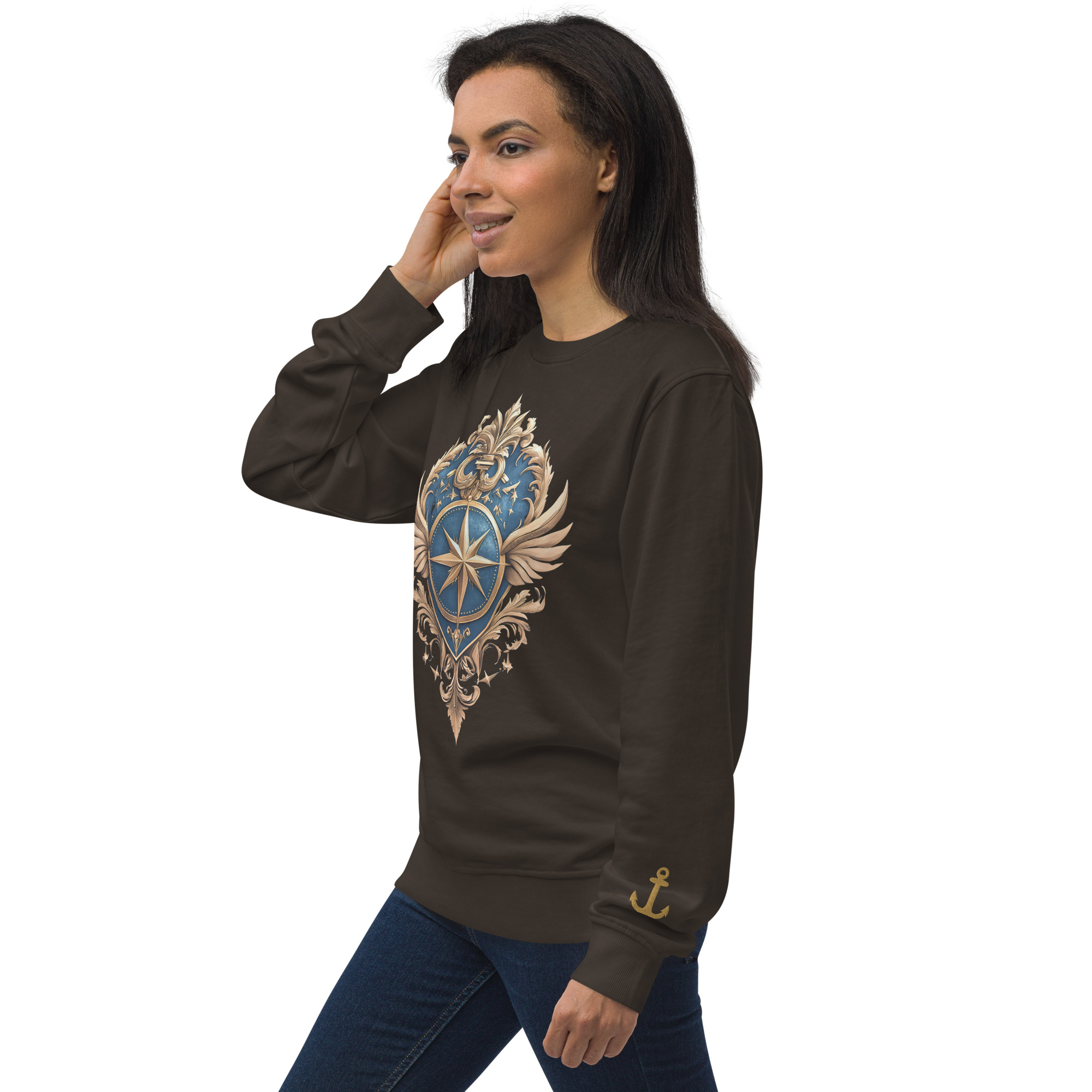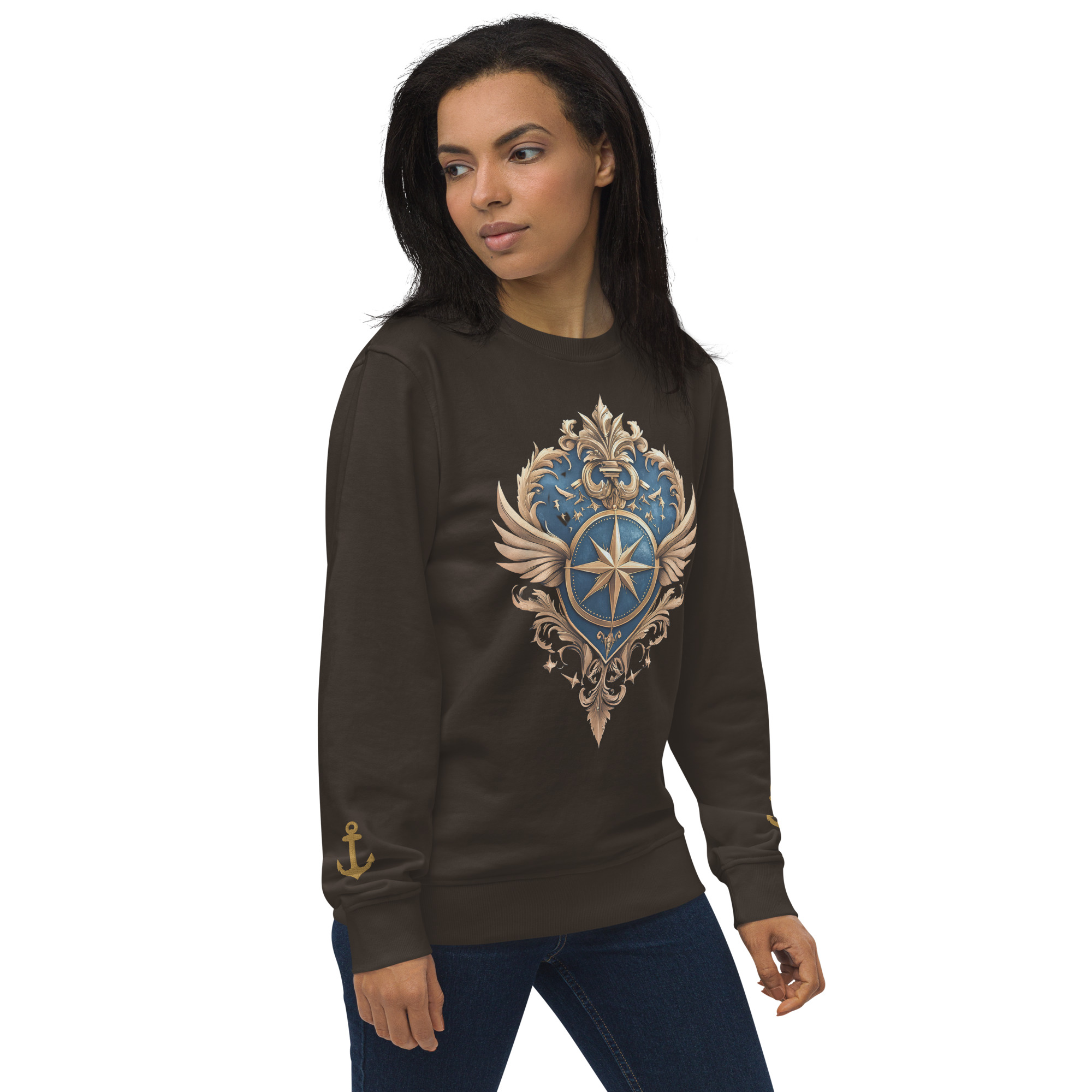Ein warmer, weicher Unisex Bio-Pullover mit dem Kurszeichen-Kompass auf der Brust und zwei eingestickten Ankern an den Ärmeln. Maritime Symbolik, klarer Style – aus der Trophy-Style-Kategorie im RUPPOshop. Logo RUPPOdesign am Außen-Etikett hinten.