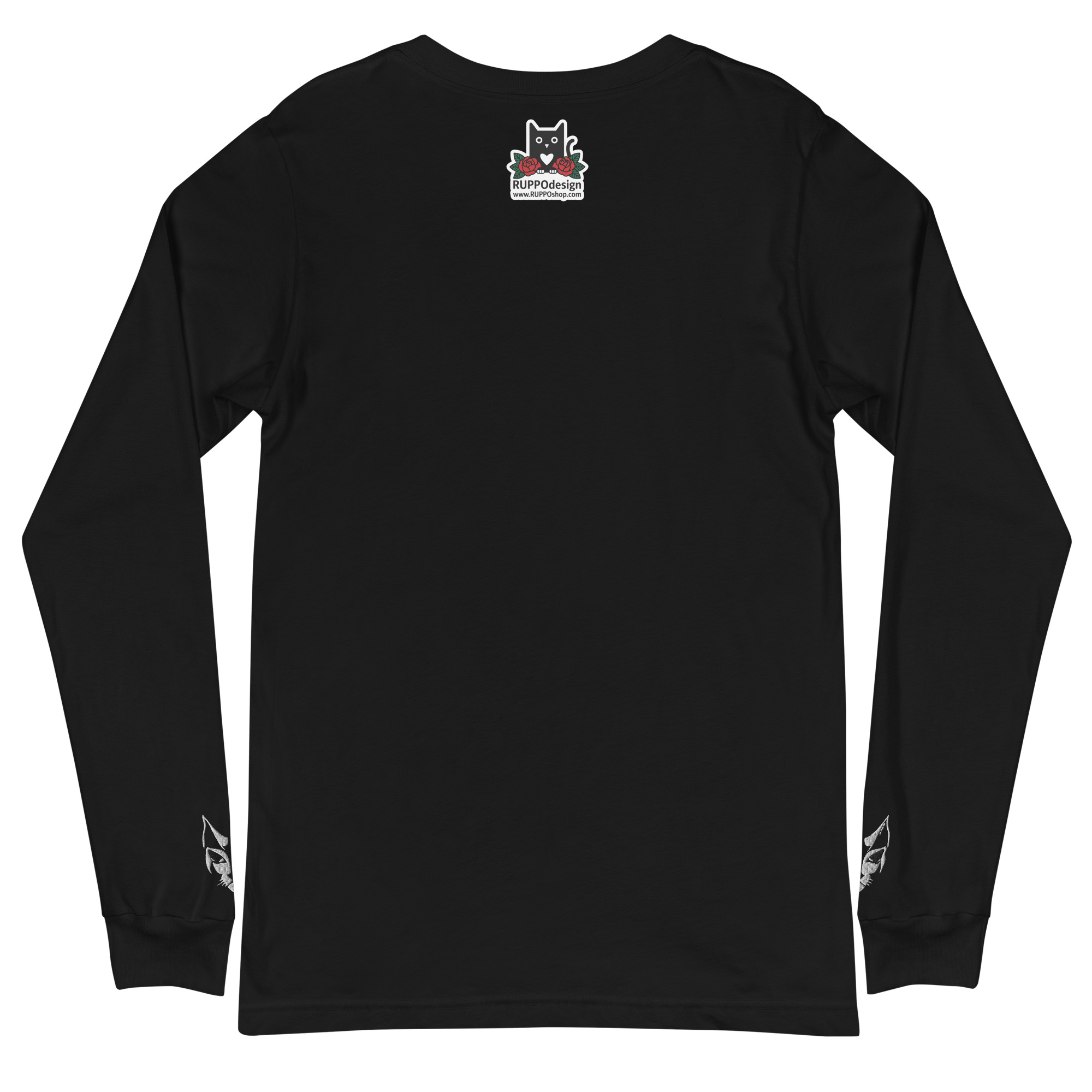 Auf den Ärmeln ist jeweils ein gestickter Katzenprint.
